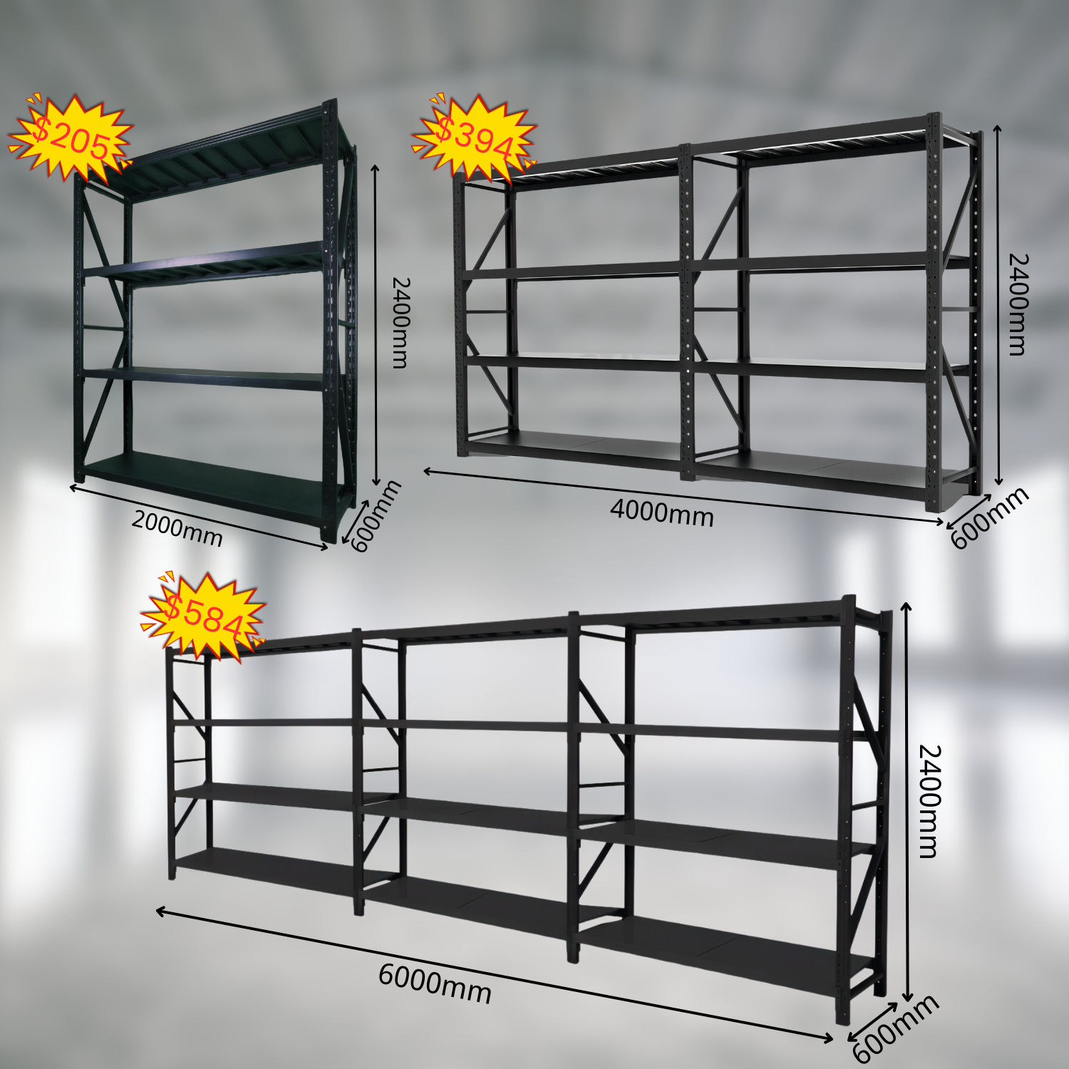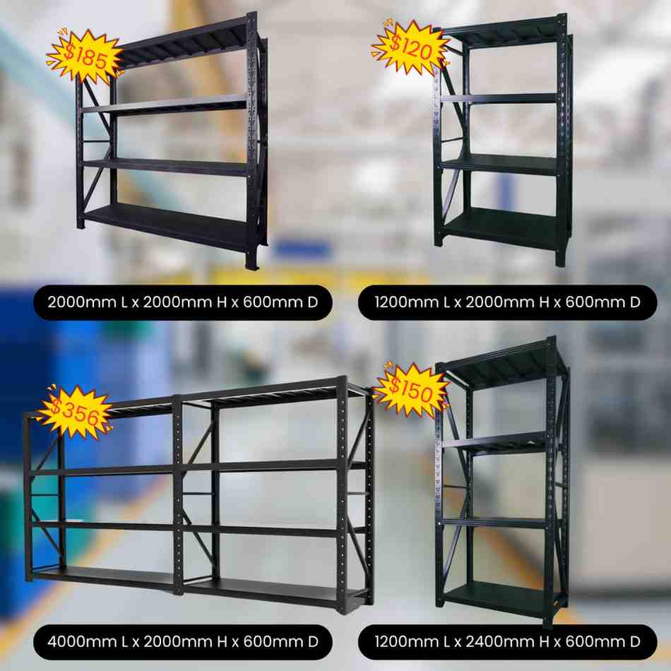 Maximize your storage with our sturdy steel shelving units, perfect for garages, workshops, light duty warehouses, or sheds. Each unit can support up to 600kg, providing reliable strength for your storage needs.