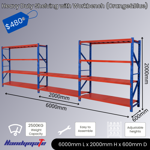 6Mx2Mx0.6M 2500KG Garage Warehouse Steel Storage Shelving Shelves With Workbench (Orange&Blue)