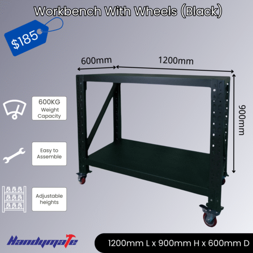 [90km Free Delivery] 1.2Mx0.9Mx0.6M 600KG Garage Warehouse Steel Workbench with Wheels 2 Levels Industrial Style (Black)