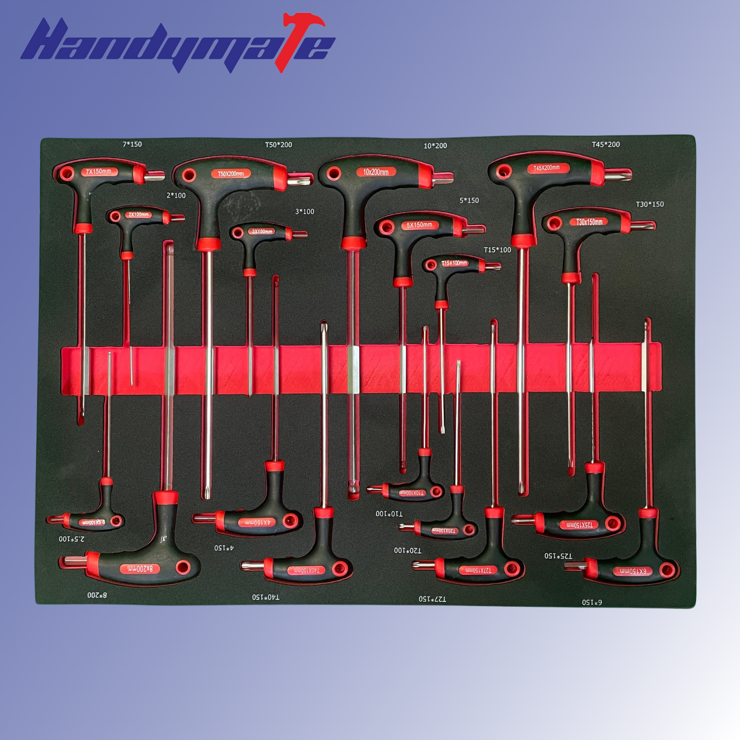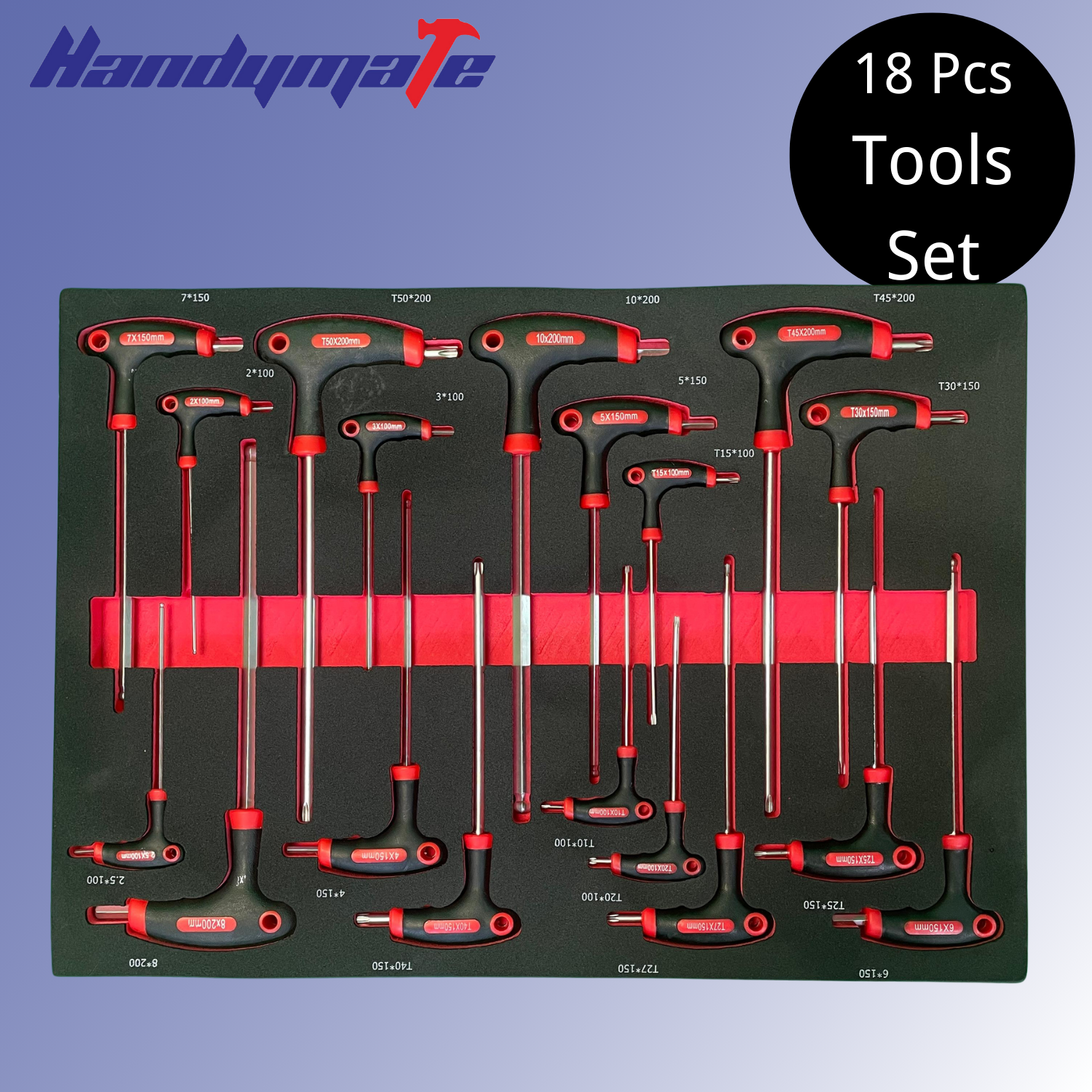 18PC – T Type Hex Key: H2*100, H2.5*100, H3*100, H4*150, H5*150, H6*150, H7*150, H8*200, H10*200, T10*100, T15*100, T20*100, T25*150, T27*150, T30*150, T40*150, T45*200, T50*200