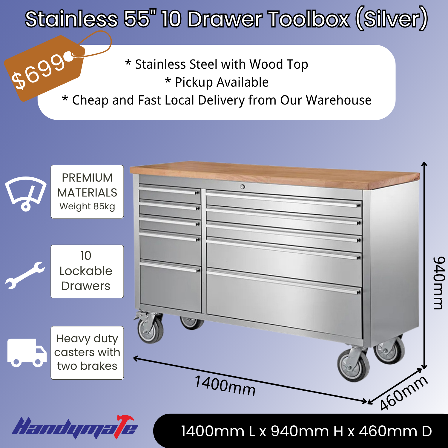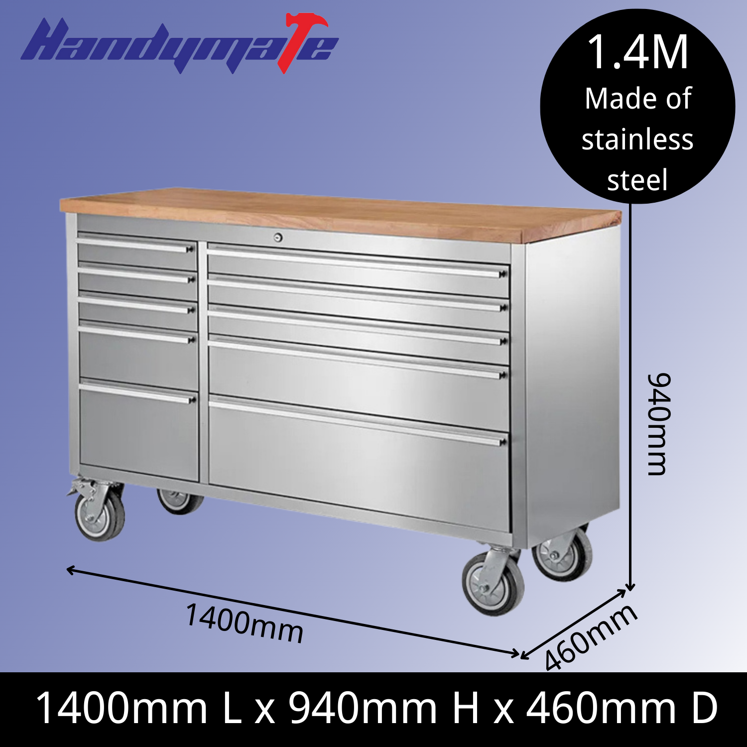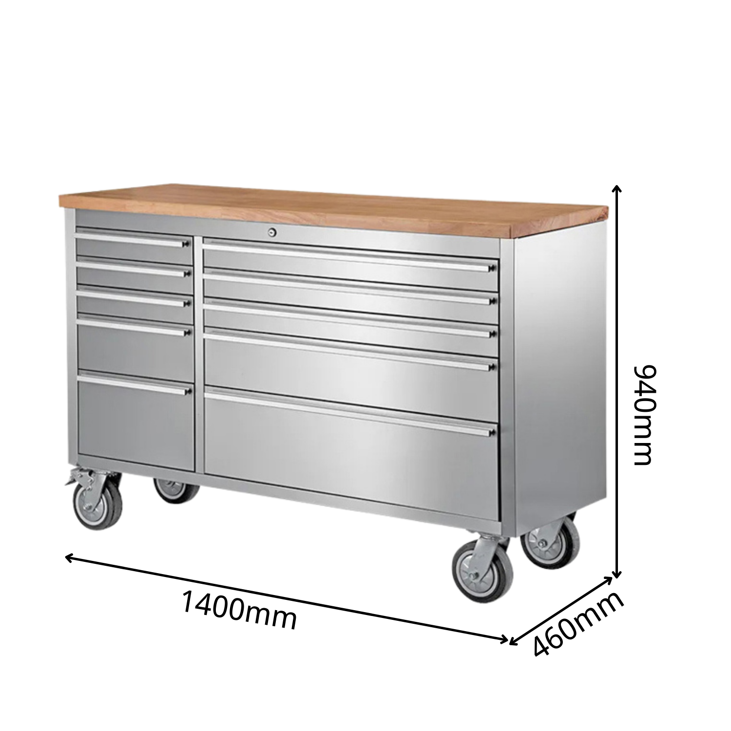 Constructed with anti-fingerprint stainless steel and toopped with a 30mm thick rubber wood top. working surface, this work bench is a must have for any workshop. Features: 10 drawers All Anti-fingerprint stainless steel EVA mat drawer liners protect tools and work bench Full extension Ball Bearing drawer slides hold up to 45kg Aluminium handles for easy positioning Heavy duty casters with two brakes 30mm thick rubber wood top Tubular heavy duty handles.