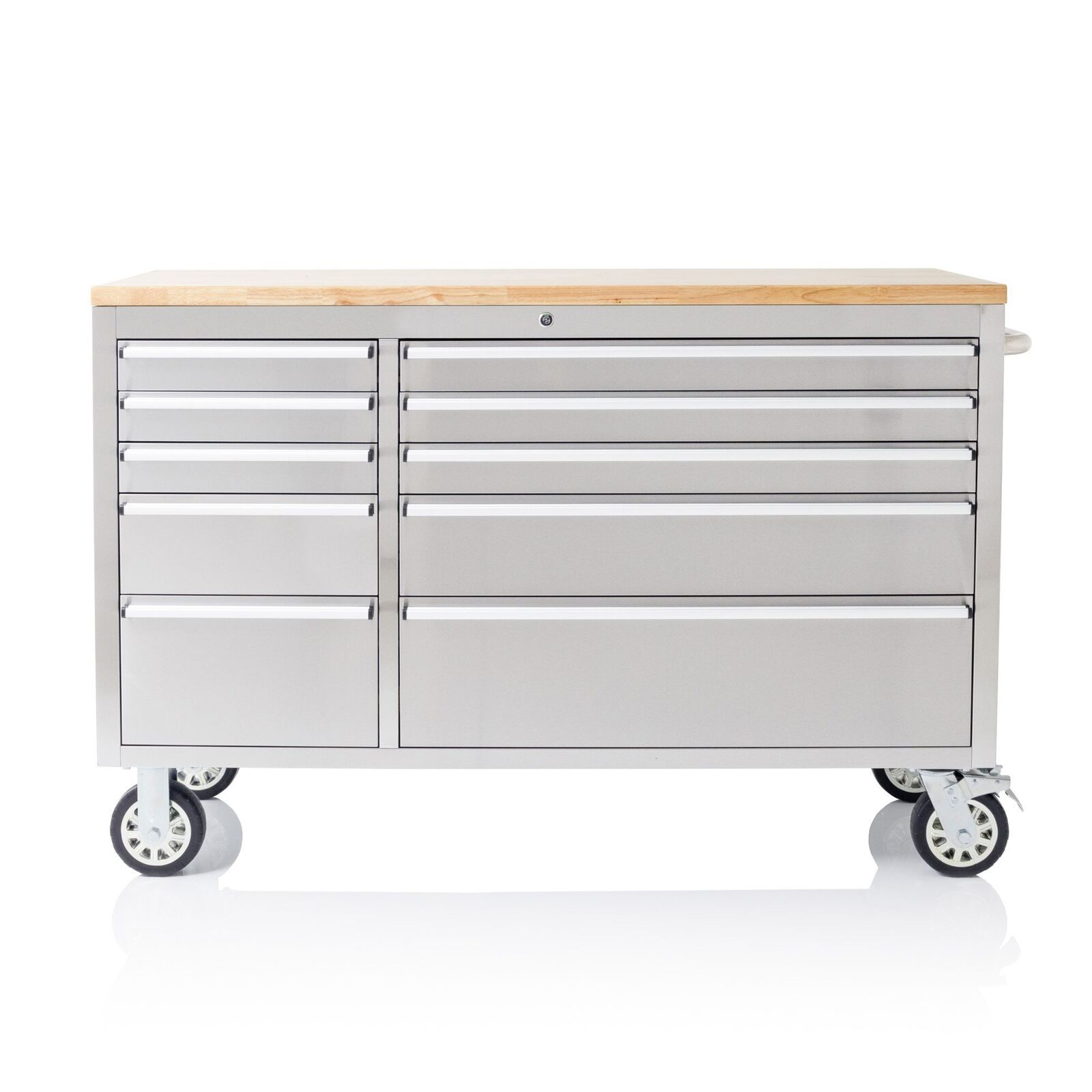 55″ 10 Drawer Mobile Workbench Stainless Steel Toolbox Cabinet with Wood Top (Silver)