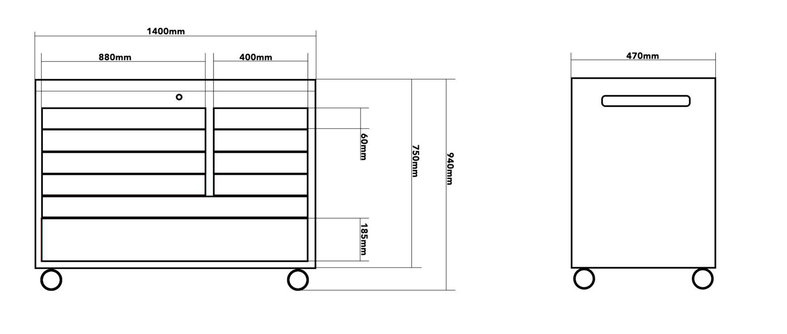 bench Full extension Ball Bearing drawer slides hold up to 45kg Aluminium handles for easy positioning Heavy duty casters with two